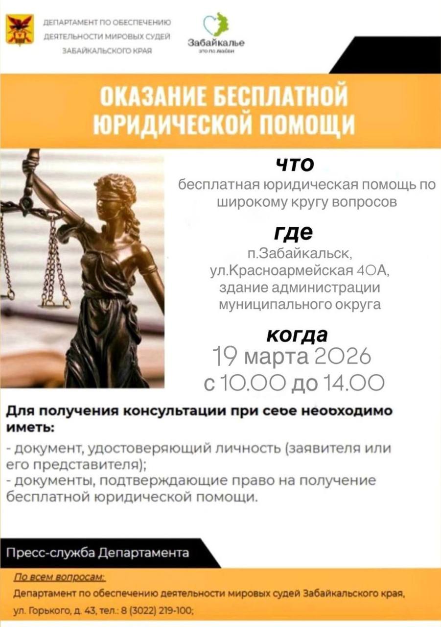 19 марта 2026 года в пгт. Забайкальск, ул. Красноармейская, 40А (здание администрации муниципального округа) с 10.00 ч. до 14.00 ч. пройдет День бесплатной юридической помощи для жителей округа, на котором гражданам будет оказана консультационная помощь специалистами краевых министерств и ведомств.